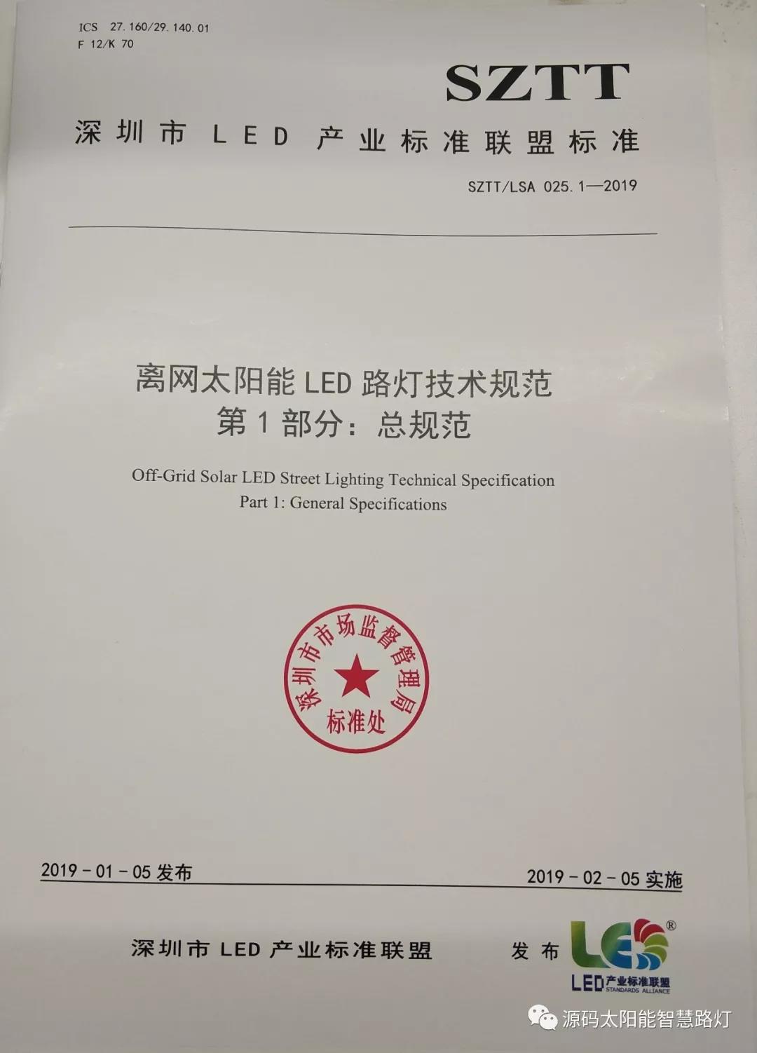 2019年1月5日,深圳市LED產(chǎn)業(yè)標準聯(lián)盟首次正式對外發(fā)布了《離網(wǎng)太陽能LED路燈技術規(guī)范》聯(lián)盟標準。《離網(wǎng)太陽能LED路燈技術規(guī)范》聯(lián)盟標準包含SZTT/LSA 025.1-2019《總規(guī)范》和SZTT/LSA 025.2-2019《燈桿及安裝技術規(guī)范》兩部分,主要由深圳源創(chuàng)智能照明有限公司、深圳市計量質量檢測研究院、深圳清華大學研究院、深圳市標準技術研究院、國家半導體光源產(chǎn)品質量監(jiān)督檢驗中心、廣東省南粵質量技術研究院等共同起草。